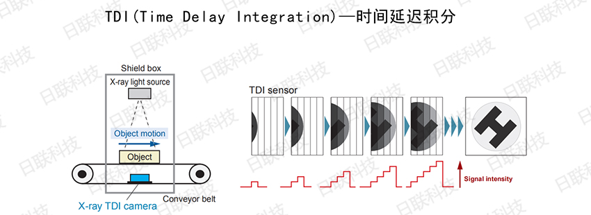 就普通線陣成像器來說,線陣成像器的成像區(qū)域如第一幅圖,可以理解為一條線,但TDI則不止,它有好幾條線并列來進行成像,如上圖右邊TDI sensor中有五條線,當物體移動時每條線都在取圖,**進行整合??梢院唵卫斫鉃椋憾鄺l線陣,每條線陣檢測取圖后將數(shù)據(jù)疊加,可以看作物體被檢測曝光了多次,增加了有效信息,因此相較傳統(tǒng)LDA動態(tài)范圍寬,響應度高,且即使在光線較暗的場所,也能輸出質量較高的圖像。