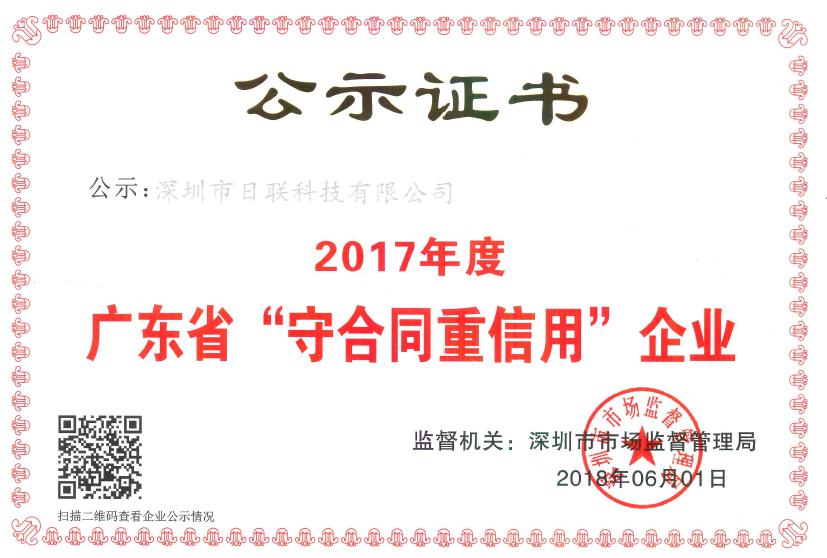 近日,廣東省工商行政管理局發(fā)布關(guān)于2017年度 “廣東省守合同重信用企業(yè)”的公告,日聯(lián)科技憑借十多年來(lái)的積累與信譽(yù),再度榮獲“守合同重信用企業(yè)”這一榮譽(yù)稱(chēng)號(hào)。