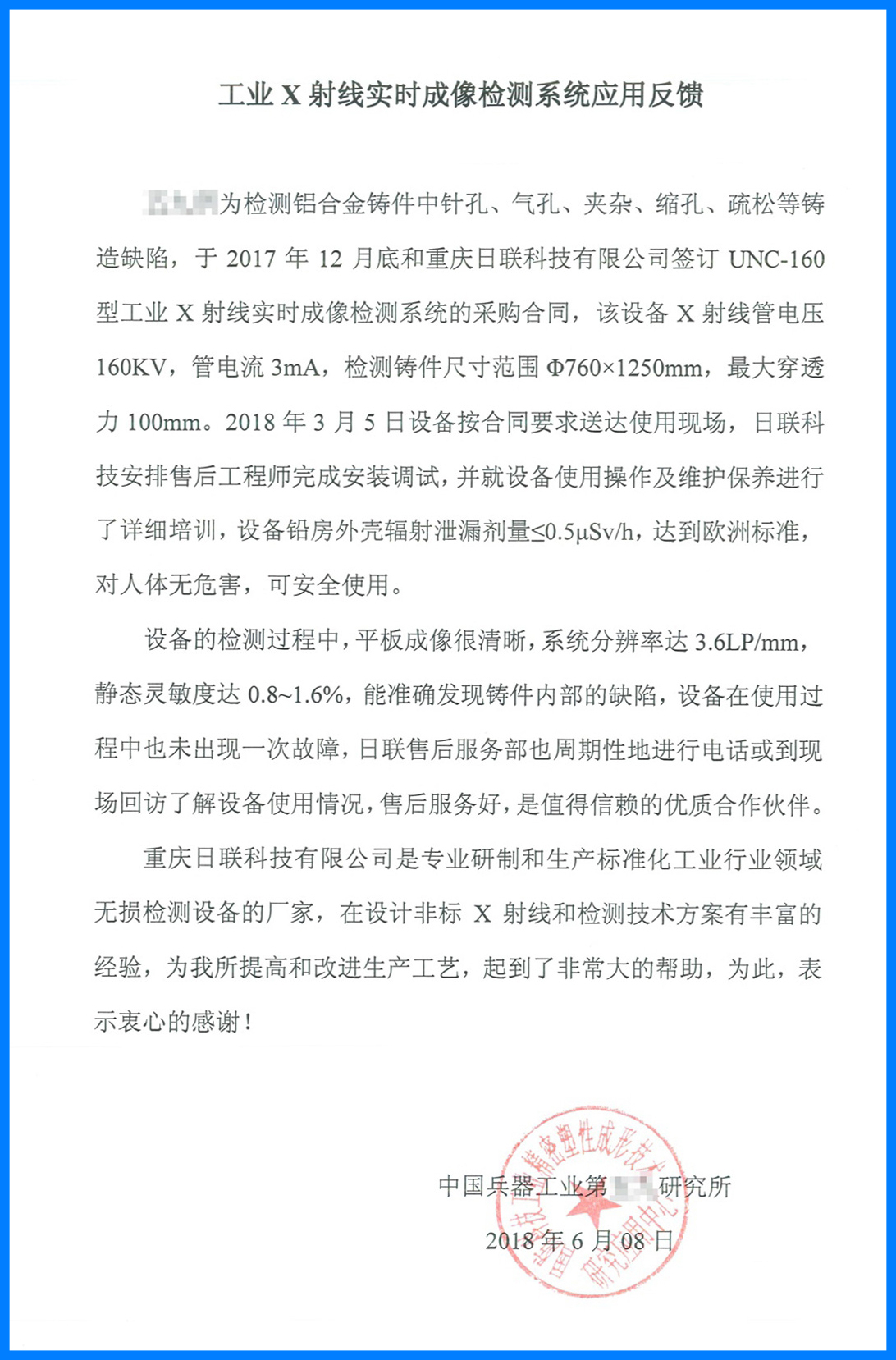 近日,日聯(lián)科技收到了中國兵器工業(yè)集團(tuán)反饋的用戶使用報告。在該報告中,中國兵器工業(yè)集團(tuán)對我司設(shè)備穩(wěn)定可靠的工作性能、專業(yè)細(xì)致的售后服務(wù)、完善詳盡的操作培訓(xùn)給予了高度的認(rèn)可和評價,并重點(diǎn)指出我們的UNC160工業(yè)X射線實(shí)時成像檢測設(shè)備能準(zhǔn)確發(fā)現(xiàn)鑄件的內(nèi)部缺陷,為他們產(chǎn)品質(zhì)量的提高和生產(chǎn)工業(yè)的改進(jìn)提供了可靠保障,稱贊我們?nèi)章?lián)科技為值得信賴的企業(yè)合作伙伴。
